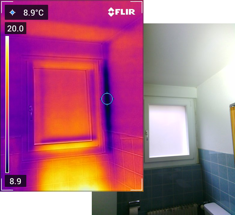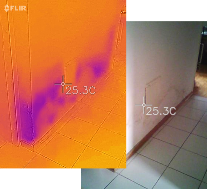 Thermographie infrarouge d’un mur touché par une infiltration d’eau.